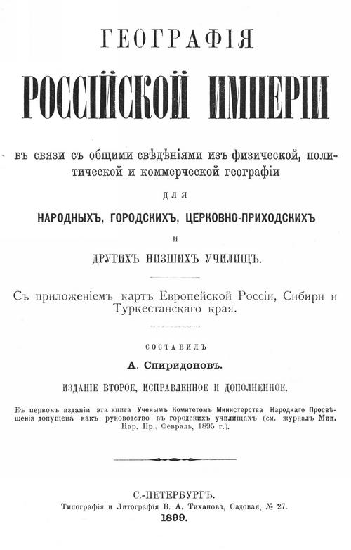 География Российской империи во связи с общими сведениями из физической, политической и коммерческой географии для народных, городских, церковно-приходских и других низших училищ : С прил. карт Евр. и Азиат. России / Сост. А. Е. Спиридонов. — 2-е изд., испр. и доп. — Санкт-Петербург : типо-лит. В. А. Тиханова, 1899. — 146 с.